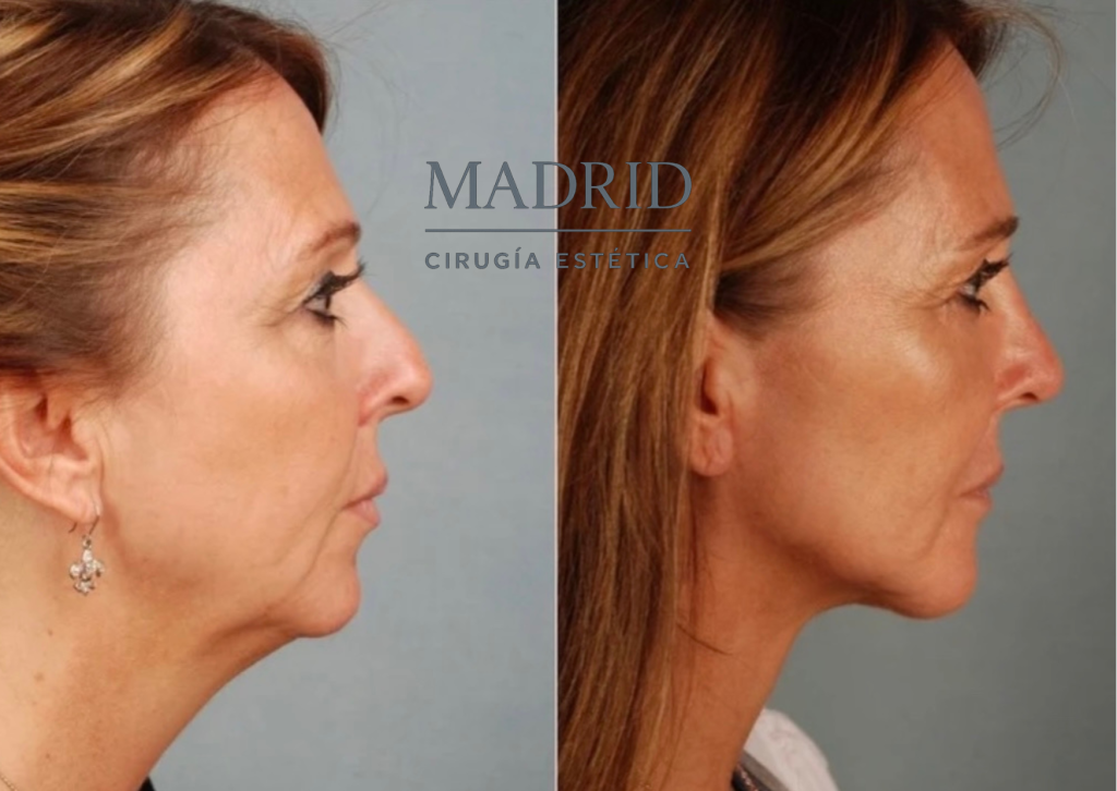 Antes y después de un Mini lifting con blefaroplastia inferior, lipofilling y eliminación de papada